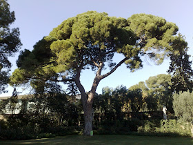 Este otro ejemplar, también catalogado por el Ayuntamiento, está en Pedralbes. Refleja muy bien la figura de estos pinos: el tronco es cilíndrico, recto. Su copa es amplia y densa, de color verde intenso: se extiende como un parasol.